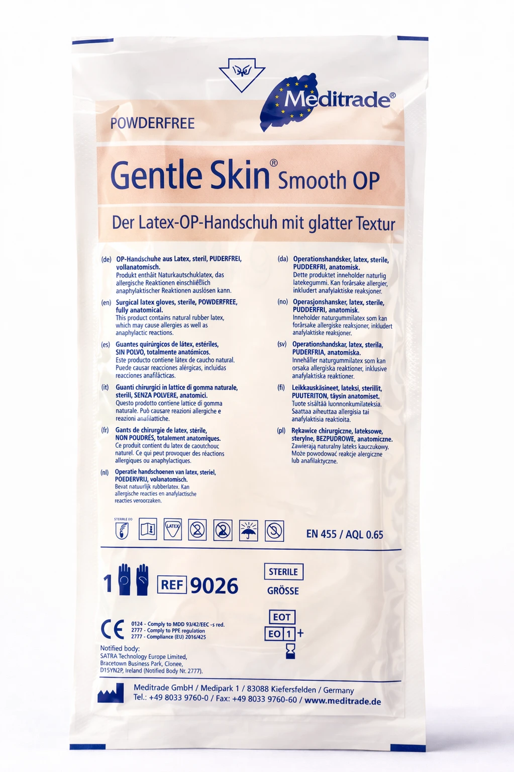 Rękawice chirurgiczne lateksowe bezpudrowe marki Meditrade to wysokiej jakości jednorazowy wyrób medyczny, przeznaczony do zabiegów wymagających precyzji i pełnej higieny. Każda para zapakowana jest sterylnie w osobny blister, co gwarantuje bezpieczeństwo i wygodę użytkowania. Najważniejsze cechy produktu: